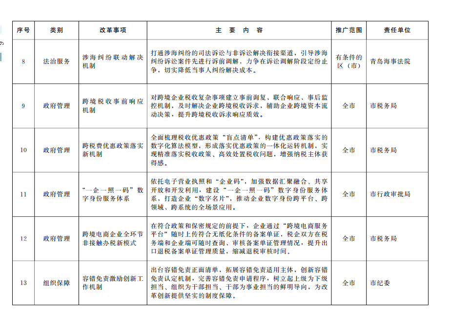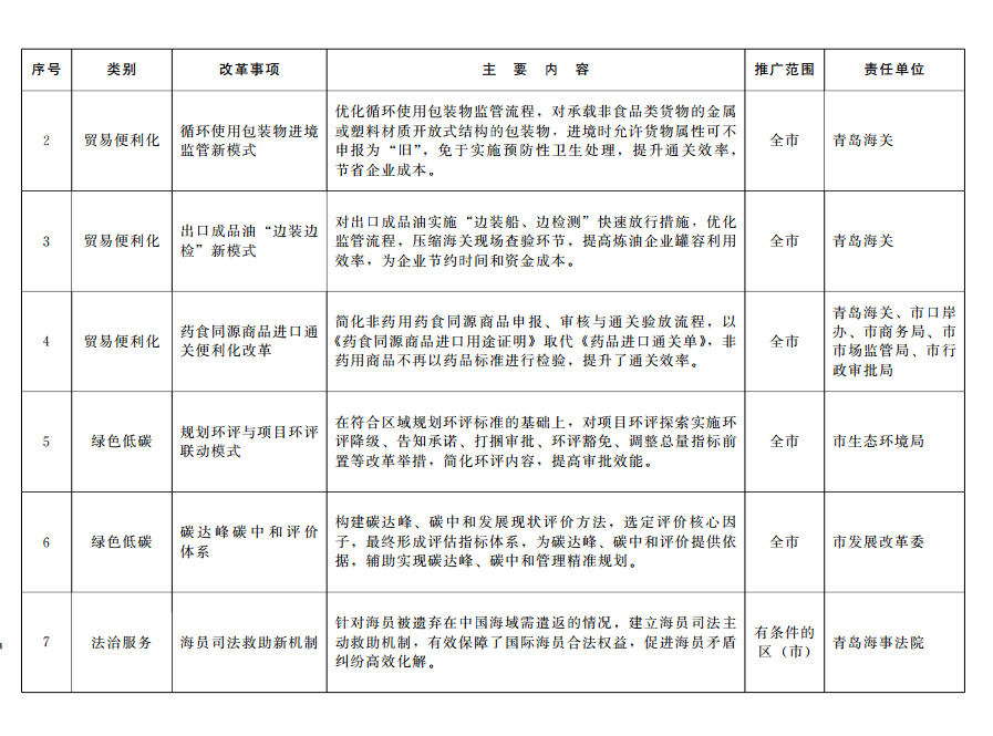 2024年以來,全市各級各部門充分發(fā)揮中國(山東)自由貿(mào)易試驗區(qū)青島片區(qū)(以下簡稱青島自貿(mào)片區(qū))改革開放試驗田作用,堅持以制度創(chuàng)新為核心,大膽試、大膽闖、自主改,全力推進自貿(mào)試驗區(qū)改革創(chuàng)新實踐,形成了新一批制度創(chuàng)新成果。經(jīng)市政府同意,16項制度創(chuàng)新成果在全市推廣?,F(xiàn)就有關事宜通知如下: